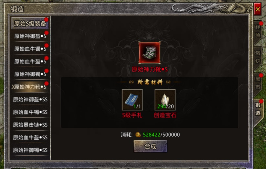 相信玩家朋友都知道在原始传奇手游中能够额外属性加成的原始S级装备,与三转以上的首饰融合后,可使角色相应的整体属性值按百分比提升。下面小编整理分享原始传奇S装备怎么分解合成,攻略技巧:一、原始传奇S级装备如何锻造不同类型的原始S级和SS级装备,有着不同类型的额外属性加成,包括暴击、防御、魔防和HP等。【锻造方式】:S级装备由S级手札和创造宝石锻造而来,SS级装备则需要s级装备和创造宝石,都消耗相应的传奇币。【提示】:原始暴击链·S只有在特殊活动中获得,不能通过锻造得到。【材料来源】:S级手札从击杀boss和限时活动中获得;创造宝石的获得途径有:击杀boss、开启火龙宝箱、装备熔炼以及周末活动中的