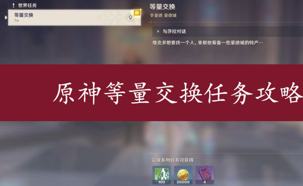 原石游戏中,有很多随机刷新的任务,在原神蒙德的声望中有一个叫做[等量交换]的任务,等量交换任务需要完成一个前置的愚人众发布的每日任务(来自冬天的故事)才能触发,具体怎么完成,小编下面整理分享原神等量交换任务完成攻略,及前置条件触发? 一、原神等量交换任务前置条件触发 1、原神等量交换任务触发方法触发要求: 完成前置任务[来自冬天的故事],这个任务是蒙德城的每日任务中随机触发的。 2、[任务奖励]:原石*10、摩拉*1850-3775、冒险阅历*175-250、好感经验*15-35、精锻用良矿*0-3、精锻用魔矿*0-2、额外奖励的摩拉*2000 3、任务接取:在完成了前置任务[来