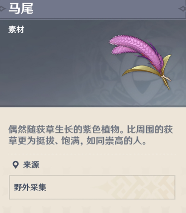 马尾多生于璃月的河边和池塘边,尽量去璃月的河边找找,一般都在黄色的芦苇丛中。不少旅行者都想知道马尾到底有什么用,针对此,小编整理分享原神马尾有什么用?4大作用分享: 一、鱼饵:飞蝇假饵合成材料 2.1版本更新后,开启钓鱼系统后 飞蝇假饵图纸获取方式 在蒙德城鱼商NPc:楠塔克处 二、食材:色云锅巴合成材料 图纸获取方式 在璃月万民堂:卯师傅 偶然随荻草生长的紫色植物。比周围的荻草更为挺拔、饱满,如同崇高的人,可以用来制作食物——绝云锅巴; (食谱)队伍中所有角色物理伤害提升20%-40%,持续300秒。 多人游戏时,仅对自己的角色生效。 (普通)队伍中所有角
