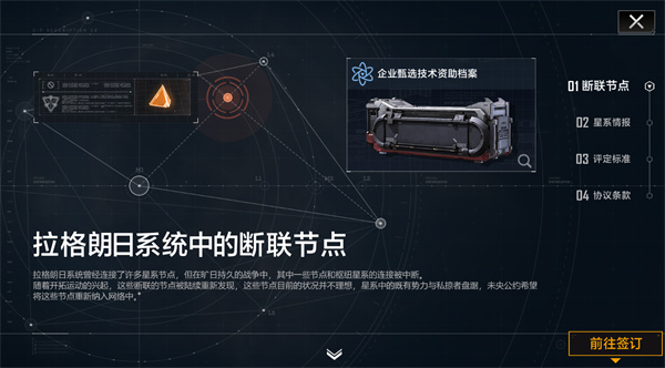 拉格朗日网络的节点曾经遍布了三分之一的银河系区域,在星际战争中,部分节点关闭了星门的通行权限,脱离了网络。然而,随着开拓运动的进行,这些断联的星系坐标被重新发现。 为了将这些节点重新接入到拉格朗日网络中,在《未央公约》的秩序下运行,安东尼奥斯财团开拓者发展部,正在枢纽星系中招募经验丰富的开拓者。开拓者们将签署《节点恢复协议》,前往目标星系,并将其重新接入到拉格朗日网络中。 《未央公约》节点恢复协议(图片仅作展示,具体内容以上线版本为准) 根据情报显示,由于星系长期处于封闭状态,星系中的私掠者已经形成了不可忽视的力量,他们已经占据了大量的太空城市,威胁着整个星系的安全。开拓者们需要