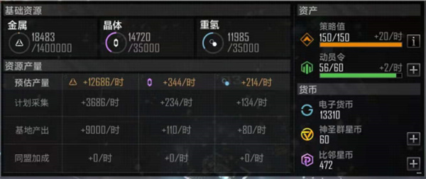 在网易手游无尽的拉格朗日不同资源有不同效果,在无尽的拉格朗日中有很多小伙伴都很想知道游戏中资源又哪些,针对此小编整理无尽的拉格朗日资源有哪些?有什么区别作用? 一、无尽的拉格朗日资源分类,有哪些资源 无尽的拉格朗日游戏中资源,我们可以大致分为基础资源与稀有资源。 1、基础资源 金属、晶体、重氢、动员令、预制模组、策略值与电子货币 2、稀有资源 神圣群星币、比邻星币 二、无尽的拉格朗日资源有什么区别作用 (一)基础资源作用 1、【金属、晶体、重氢】是建设基地、建造舰船时使用的资源,也是游戏中最为重要的资源。 2、【动员令】的作用是缩短基地建设的时间。 3、【策略值】是我