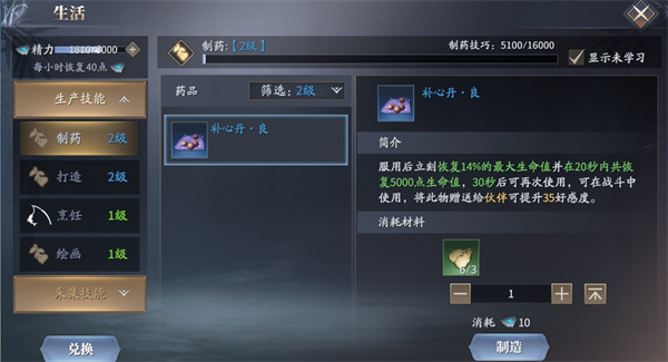 庆余年手游有生活技能的学习场景,不少人不知道怎么选择,游戏中如何依靠生活技能来赚钱,对此小编下面整理分享庆余年手游生活技能怎么学,怎么选择? 一、庆余年手游生活技能基础介绍 1、有哪8类 共有制药、打造、烹饪、绘画、采药、挖矿、钓鱼、制色8个技能。 2、怎么提升等级 比较简单,需要什么直接去采集,选择采集次数,即可提升等级。 3、怎么恢复精力 生活技能需要消耗精力,每小时恢复40点(无论是否在线),如急用也可用游厉点兑换鸡蛋(每周限5个恢复2500精力)。 二、庆余年手游生活技能怎么学,怎么选择?【打单攻略】 【分析】学采集技能在游戏中是没有什么前途的,因为这个生活技能每