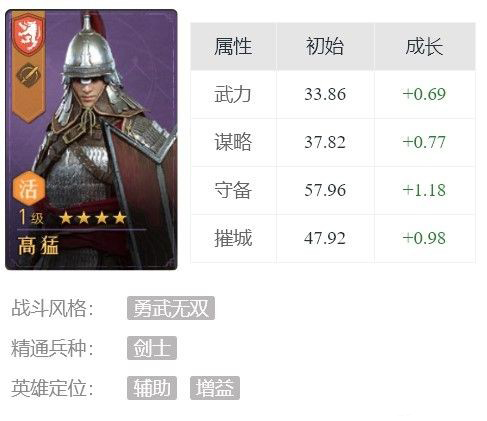 在重返帝国手游中,高猛是属于游戏重点紫卡英雄。针对此小编下面分享重返帝国高猛怎么玩,属性介绍: 一、重返帝国高猛英雄属性 1、【战斗风格】:勇武无双 2、【精通兵种】:剑士 3、【英雄定位】:辅助,增益 4、【武力】:33.86 5、【谋略】:37.82 6、【守备】:57.96 7、【摧城】:47.92 二、重返帝国高猛技能介绍 1、【盾牌猛攻】:对敌军单体造成武力伤害(伤害率:400%,守备加成),持续6秒。 2、【长盾庇护】:随机使我军受到的武力伤害或谋略伤害降低13.75%=>15.00%(守备加成,武力减伤、谋略减伤触发概率相等),持续3秒。 内容整