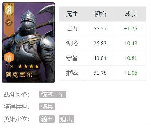 在重返帝国手游中,阿克塞尔是属于游戏中的紫卡英雄。针对此小编下面分享重返帝国阿克塞尔怎么玩,属性介绍: 一、重返帝国阿克塞尔英雄属性 1、【战斗风格】:统御三军 2、【精通兵种】:骑兵 3、【英雄定位】:输出、追击 4、【武力】:55.57 5、【谋略】:25.83 6、【守备】:43.84 7、【摧城】:51.78 二、重返帝国阿克塞尔技能介绍 1、【纵横猛攻】:攻击目标敌军,造成武力伤害 2、【凶猛追击】:普通攻击后,再次造成一次武力伤害(伤害率:110%,武力加成),并在3秒内提升自身造成的武力伤害11%(武力加成) 内容整理来源:网络整理 重返帝国阿克塞尔