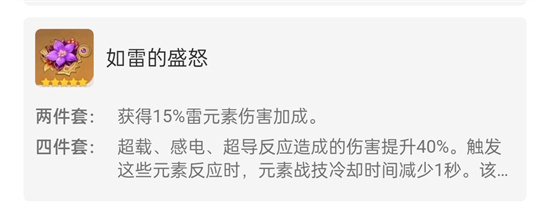 上篇介绍了《原神菲谢尔武器推荐选择,如何选择》,下面小编分享原神菲谢尔圣遗物搭配推荐选择: 一、原神菲谢尔圣遗物搭配推荐选择 副c皇女 时之沙固定攻击力%,空之杯固定雷元素伤害加成%,理之冠固定暴击%/爆伤% 1、 泛用性最广: 2如雷+2角斗士/2追忆 或四千岩 2、进剧变反应队:四如雷或2如雷+2乐团 3、风c后台辅助/纯雷队:四平雷 内容整理来源:米游社/伊丽莎白桂 二、圣遗物属性说明 1、如雷的盛怒 两件套:获得15%雷元素伤害加成。 四件套:超载、感电、超导反应造成的伤害提升40%。触发这些元素反应时,元素战技时间减少1秒。 2、角斗士的终幕礼 两件套:
