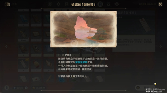 我们都知道原神特别的御神签是个隐藏的世界任务,也知道原神特别的御神签任务需要分4天完成,上篇我们分享怎么触发这个隐藏任务《原神特别的御神签触发攻略》,接下来小编分享原神特别的御神签第一天任务攻略步骤: 1、【去鸣神大社求签、交付竹签】 首先来到鸣神大社东南侧求签的地方,选择“御神签箱”来抽签。 第一步:通过御神签箱抽签 抽签之后与玄冬林檎对话交付竹签,选择带有暗号“胧夜正中”的选项。 第二步:交付竹签对暗号 之后她就会给我们一个任务道具「诡谲的御神签」,打开后就能获得当天的提示。 ▲阅读签文获取提示 2、【对敌人降下「终末」】 根据图片以及文字提示,我们可以找到我们的任务