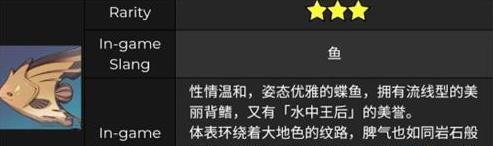 流纹褐蝶鱼是三星蝶鱼类,性格温和,流线型的背鳍,脾气和岩石一样沉稳,经常在水里不动;“流纹褐蝶鱼”是蝶鱼的一种,只是身体颜色呈褐色,而且性格温和,是比较容易钓到的鱼类,珍贵的观赏鱼,可被饲养在灵沼云池中。。接下来红手指小编整理原神流纹褐蝶鱼在哪钓,原神流纹褐蝶鱼钓鱼攻略: 一、原神流纹褐蝶鱼介绍 流纹褐蝶鱼性情温和,姿态优雅的碟鱼,拥有流线型的美丽背鳍,又有「水中王后」的美誉。 体表环绕着大地色的纹路,脾气也如同岩石般沉稳,缺点是沉稳过头了,有时会像岩石一样沉在水底不动,以致常让买家怀疑买到了已经无力回天的老头鱼。 二、原神流纹褐蝶鱼在哪钓 1、流纹褐蝶鱼可以在璃月地图钓到,需要