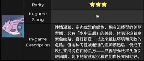 原神游戏中流纹京紫蝶鱼,是新版本中增加的鱼类,珍贵的观赏鱼,可被饲养在灵沼云池中。流纹京紫蝶鱼是3星的鱼类,而且还比较喜欢群居,我们只要能钓到第一条鱼,就可以钓到第二条鱼。在原神游戏中,流纹京紫蝶鱼可以在稻妻的甘金岛、名椎滩、水月池、珊瑚宫、越石村西、越石村东钓鱼点垂钓获得。接下来红手指小编整理原神流纹京紫蝶鱼在哪钓,原神流纹京紫蝶鱼钓鱼攻略: 一、原神流纹京紫蝶鱼介绍 流纹京紫蝶鱼京紫蝶鱼性情温和,姿态优雅的鲽鱼,拥有流线型的美丽背鳍,又有「水中王后」的美誉。体表环绕着京紫色纹路,喜好群居,以此来抵抗环境和天敌的危险。但这种习惯被老道的鱼师摸透后,便成了反过来捕捉它们的良方——只要想