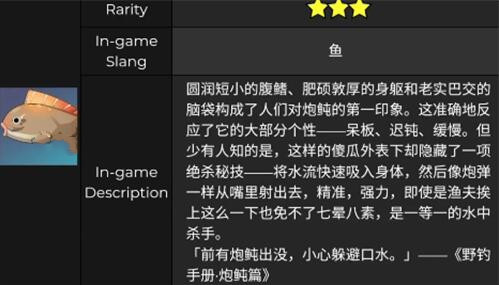 原神游戏中炮鲀的饵料是飞蝇假饵,玩家可以先在蒙德的钓鱼者协会NPC处兑换该钓饵配方,然后合成获得。炮鲀是赤穗酒枡的获取材料之一,很多玩家还不知道炮鲀在哪钓,接下来红手指小编整理原神炮鲀在哪钓,原神炮鲀钓鱼攻略: 一、原神炮鲀介绍 圆润短小的腹鳍、肥硕敦厚的身躯和老实巴交的脑袋构成了人们对炮鲀的第一印象。这准确地反应了它的大部分个性——呆板、迟钝、缓慢。 但少有人知的是,这样的傻瓜外表下却隐藏了一项绝杀秘技——将水流快速吸入身体,然后像炮弹一样从嘴里射出去,精准,强力,即使是渔夫挨上这么一下也免不了七晕八素,是一等一的水中杀手。 「前有炮鲀出没,小心躲避口水。」——《野钓手册·炮鲀篇