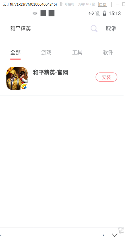 5.在云手机应用市场里搜索《和平精英》,找到并一键安装手游;